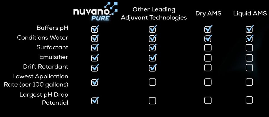 Nuvano Pure is compatible with most liquid fertilizers, pesticides and biological stimulants. As with most water conditioners, it's important to jar test compatibility prior to adding Nuvano Pure to the spray tank.